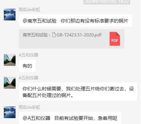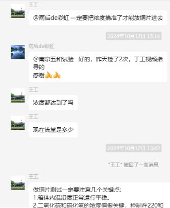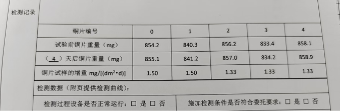 為了更好地說明銅片試驗(yàn)的重要性,下面分享一個(gè)檢測(cè)公司的銅片試驗(yàn)實(shí)際案例:2024年8月份合肥******檢測(cè)技術(shù)有限公司第一次采購(gòu)我司一臺(tái)型號(hào)為“WHQ-300B”型的混合氣體腐蝕試驗(yàn)箱,設(shè)備被運(yùn)送到客戶指定的場(chǎng)地安裝調(diào)試運(yùn)行。安裝調(diào)試后,客戶后期自行進(jìn)行一次銅片增重試驗(yàn),我司技術(shù)人員進(jìn)行線上指導(dǎo)操作,試驗(yàn)結(jié)束之后客戶將數(shù)據(jù)發(fā)給我司,以下是客戶和我司聊天記錄以及客戶做的數(shù)據(jù)信息: